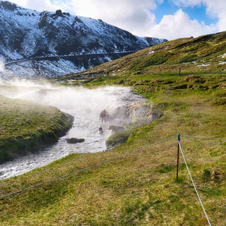 Vēl pēdējais šodienas apskates objekts ‘’ Reykjadalur Hot Spring Thermal River’’, no stāvvietas pārgājiens 3 km garumā, augšup kalnā , lai sasniegtu termālās upes baseinus. Baseini ir bezmaksas, cilvēku diezgan daudz, pārģērbšanās pa vienkāršo, piesedzam plikumus ar dvielīti aiz koka sienas. :) Mēs gan tā arī nesadūšojāmies ielīst ūdenī. Ūdens temperatūra nelikās tik kārdinoša, lai mēģinātu atrast brīvu vietiņu seklajā ūdenī starp pārējiem cilvēkiem.